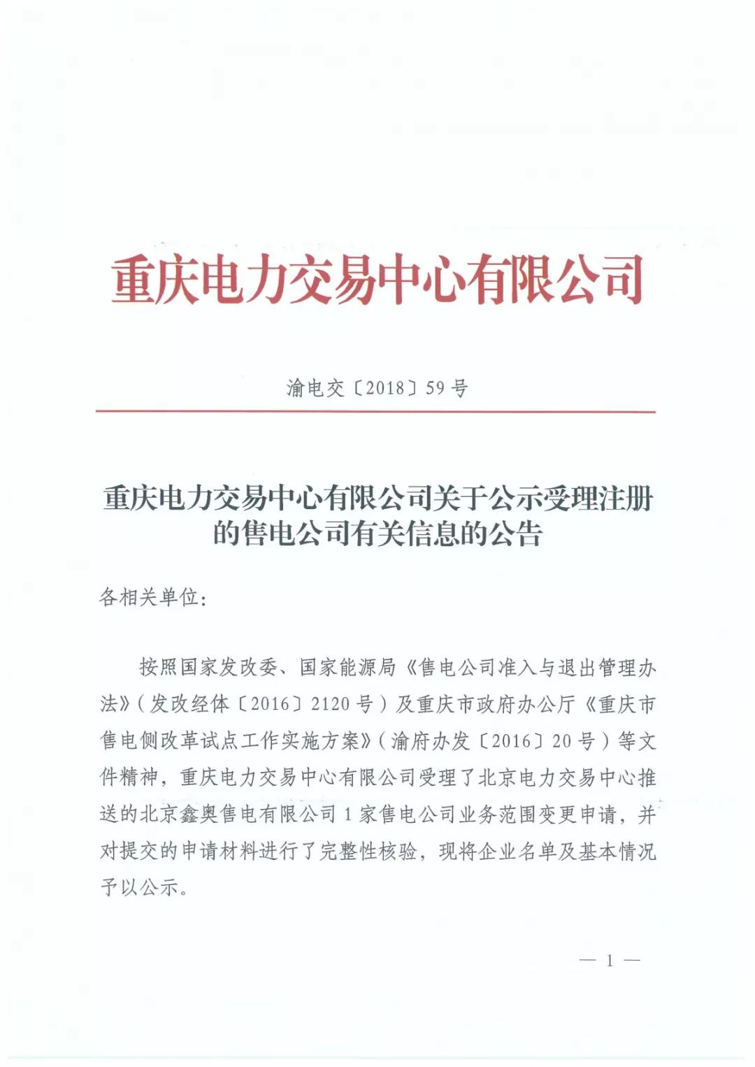 重慶關(guān)于公示受理注冊(cè)的售電公司有關(guān)信息的公告