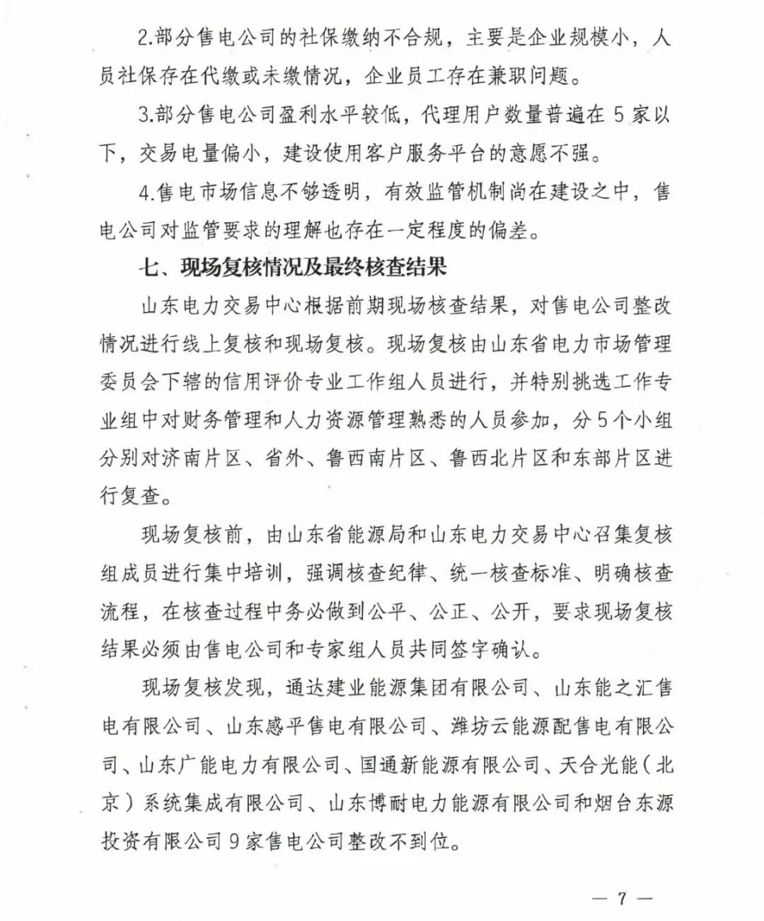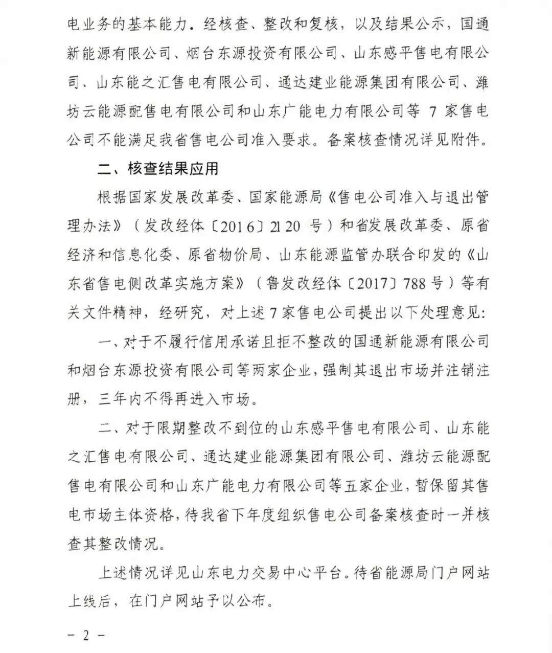 國通新能源有限公司等2家售電企業(yè)被強制退市并注銷注冊,三年內(nèi)不得再進入市場。限期整改不到位的山東感平售電有限公司等5家企業(yè),暫保留其售電市場主體資格,下年度組織售電公司備案核查時一并核查其整改情況。