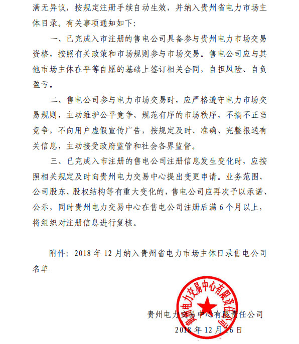 貴州電力交易中心日前發(fā)布了《關(guān)于公布2018年12月納入貴州省電力市場售電主體目錄企業(yè)名單的通知》,貴州新奧能源發(fā)展有限公司等2家售電公司注冊生效自動生效,納入貴州電力市場主體目錄。