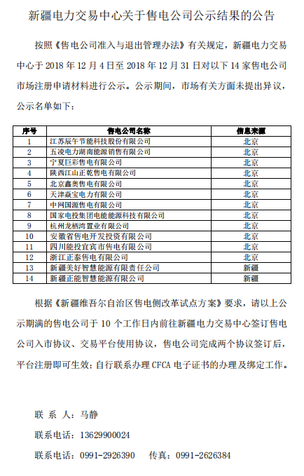 新疆電力交易中心發(fā)布了《關(guān)于售電公司公示結(jié)果的公告》