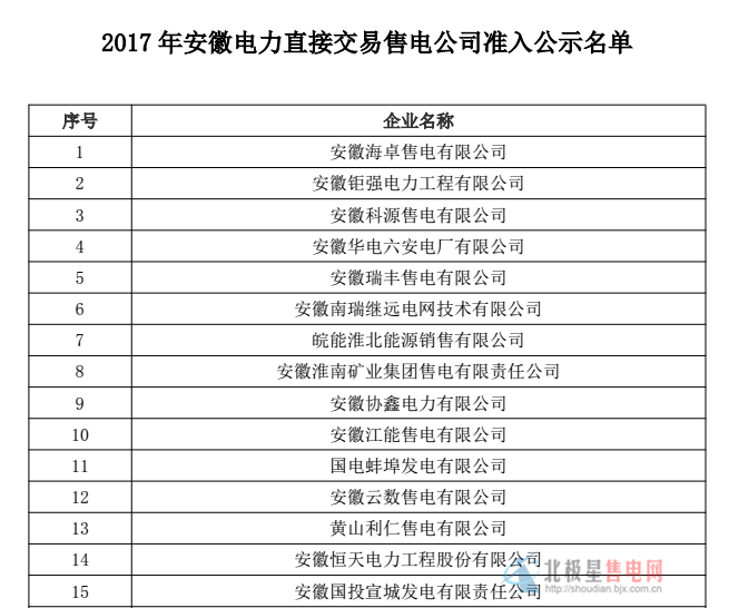 附件:2017年安徽電力直接交易售電公司準(zhǔn)入公示名單