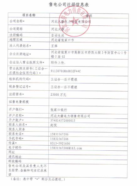 按照國家發(fā)改委、國家能源局《售電公司準(zhǔn)入與退出管理辦法》的要求,冀北電力交易中心受理了下列河北大磐電力銷售有限公司等4家公司的注冊申請,對售電公司提出的市場準(zhǔn)入申請進(jìn)行了完整性核驗,現(xiàn)將企業(yè)名單及基本情況予以公示。