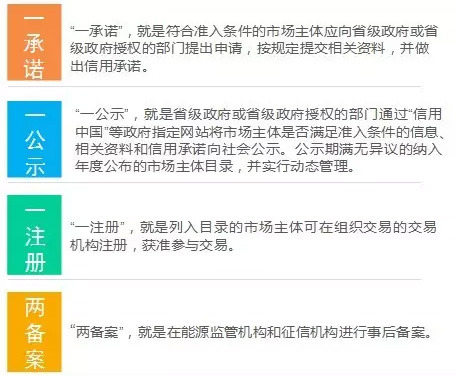 按照簡政放權(quán)的原則,《實施意見》對售電側(cè)市場的準(zhǔn)入和退出機(jī)制作了創(chuàng)新性安排,這是新一輪電力體制改革中的一個亮點。準(zhǔn)入機(jī)制方面,將以注冊認(rèn)定代替行政許可的準(zhǔn)入方式,以降低行政成本,實現(xiàn)有效監(jiān)管,提升工作效率,重點是“一承諾、一公示、一注冊、兩備案”。