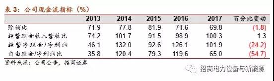 1.經(jīng)營穩(wěn)健,效率提升,盈利及現(xiàn)金流表現(xiàn)良好:2017年公司收入242億,同比下降14%,主要系電網(wǎng)自動(dòng)化中設(shè)備租賃項(xiàng)目全年業(yè)主未回購,收入無法確認(rèn)所致。公司毛利率及凈利率分別提升5個(gè)點(diǎn)及3個(gè)點(diǎn),至30%、15%,ROE超16%,盡管匯兌損益導(dǎo)致了財(cái)務(wù)費(fèi)用的增加,但費(fèi)用率水平較低,賒銷比進(jìn)一步下降,報(bào)表更加扎實(shí)。
