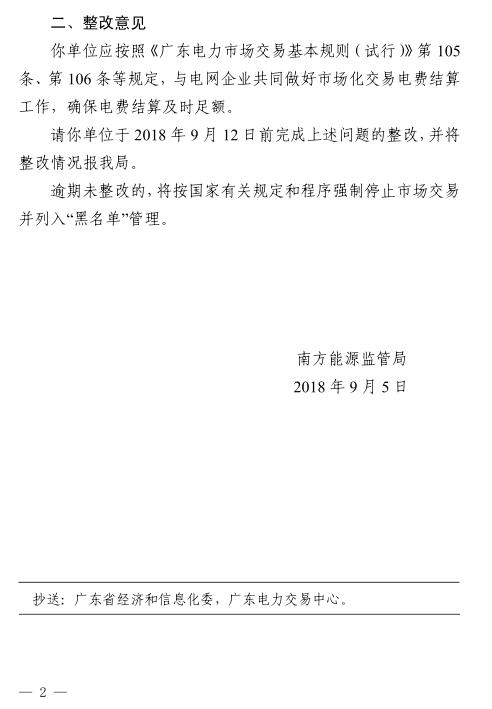 廣東佛能售電有限公司需在9月12日前完成整改。逾期未整改的,將按國(guó)家有關(guān)規(guī)定和程序強(qiáng)制停止市場(chǎng)交易并列入“黑名單”管理。
