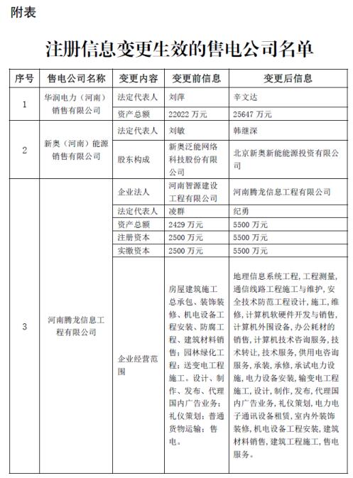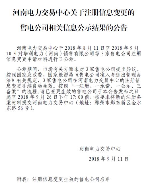 河南電力交易中心日前發(fā)布了《關(guān)于注冊(cè)信息變更的售電公司相關(guān)信息公示結(jié)果的公告》,華潤(rùn)電力(河南)銷(xiāo)售有限公司等3家售電公司注冊(cè)信息變更生效。