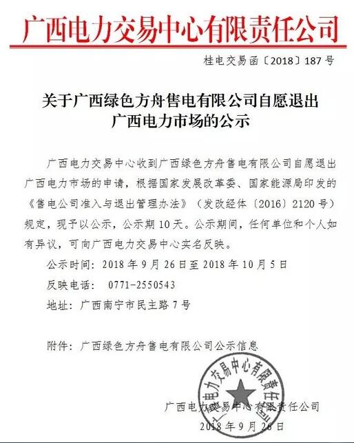 廣西電力交易中心日前發(fā)布了《關于廣西綠色方舟售電有限公司自愿退出電力市場的公示》,公示時間為9月26日至10月5日。詳情如下: