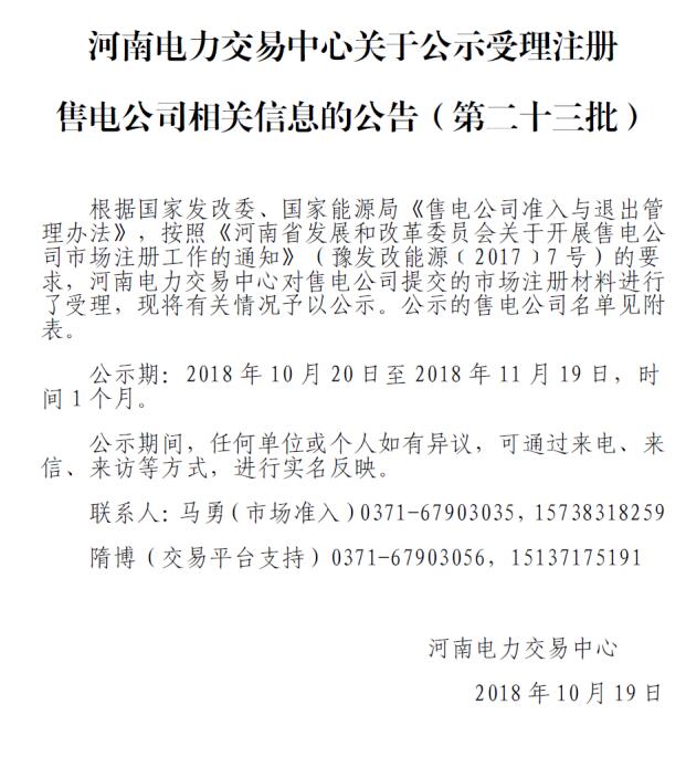 河南電力交易中心日前發(fā)布了《關于公示受理注冊售電公司相關信息的公告(第二十三批)》,公示河南省子正新能源科技有限公司等6家售電公司,公示期為2018年10月20日至11月19日,時間一個月。