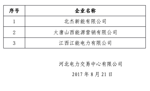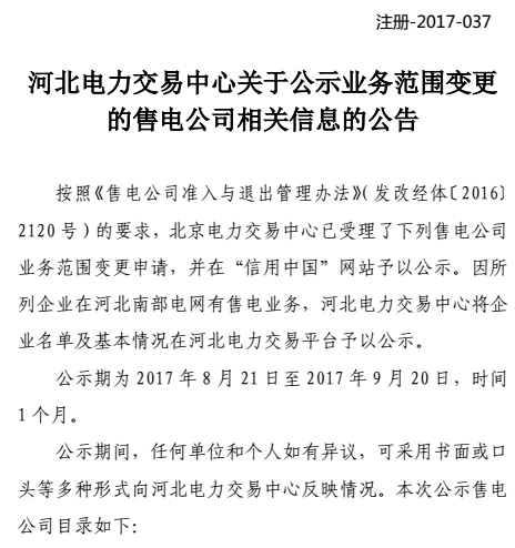 從河北電力交易中心獲悉,日前河北電力交易中心發(fā)布了關(guān)于公示業(yè)務(wù)范圍變更的售電公司相關(guān)信息的公告。北京電力交易中心已受理了包括北杰新能有限公司等3家售電公司業(yè)務(wù)范圍變更申請(qǐng),并在“信用中國(guó)”網(wǎng)站予以公示。公示期為2017年8月21日至2017年9月20日。時(shí)間1個(gè)月。