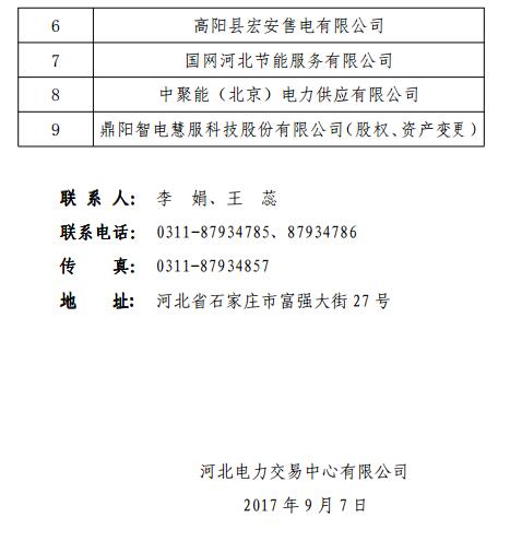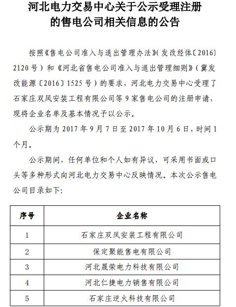 2017年9月7日,河北電力交易中心發(fā)布《河北電力交易中心關于公示受理注冊的售電公司相關信息的公告》。公告中稱,對于河北電力交易中心受理的石家莊雙鳳安裝工程有限公司等9家售電公司,以及對北京電力中心受理并