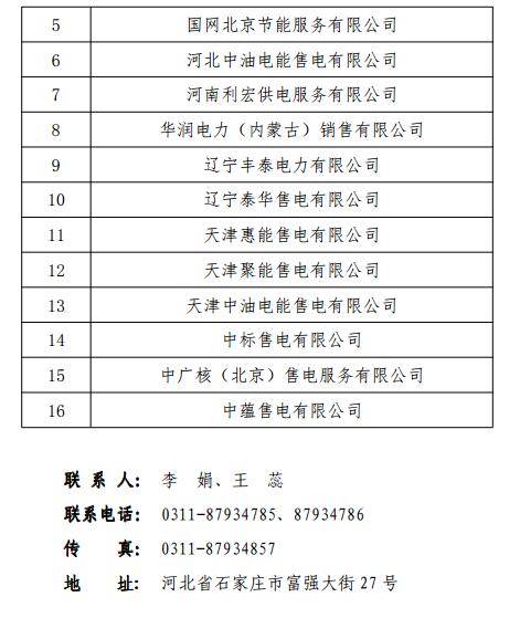 2017年9月7日,河北電力交易中心發(fā)布《河北電力交易中心關于公示受理注冊的售電公司相關信息的公告》。公告中稱,對于河北電力交易中心受理的石家莊雙鳳安裝工程有限公司等9家售電公司,以及對北京電力中心受理并在河北南部電網有售電業(yè)務的16家售電公司,共計25家售電公司名單及基本情況予以公示。詳情如下: