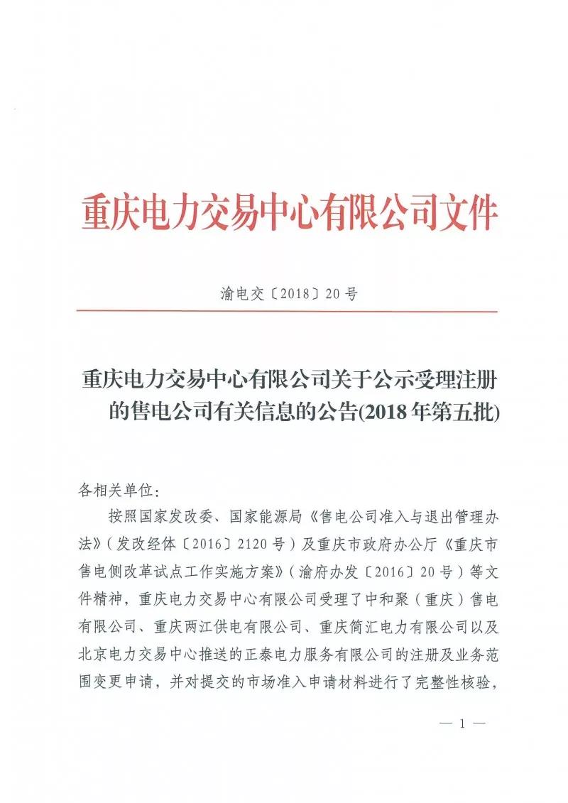 重慶電力交易中心日前發(fā)布了《關(guān)于公示受理注冊(cè)的售電公司有關(guān)信息的公告(2018年第五批)》及《關(guān)于售電公司公示結(jié)果的公告(2018年第四批),