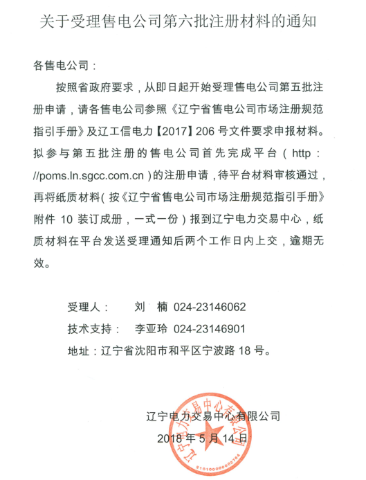 遼寧電力交易中心日前發(fā)布了《關(guān)于受理售電公司第六批注冊(cè)材料的通知》,擬參與注冊(cè)的售電公司需首先完成平臺(tái)的注冊(cè)申請(qǐng),待平臺(tái)材料審核通過,再提交紙質(zhì)材料到遼寧電力交易中心。