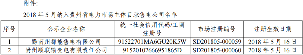 關(guān)于公布2018年5月納入貴州省電力市場(chǎng)主體目錄售電公司名單的通知