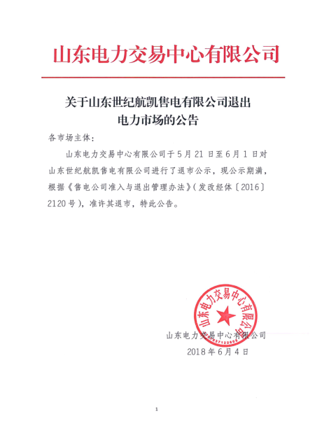 關(guān)于山東世紀(jì)航凱售電有限公司退出電力市場(chǎng)的公告