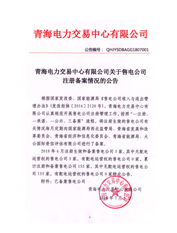 青海電力交易中心日前發(fā)布了《青海電力交易中心有限公司關(guān)于2018年7月售電公司注冊備案情況的公告》,2018年6月注冊生效和備案售電公司5家