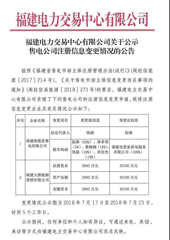 福建電力交易中心有限公司關(guān)于公示售電公司注冊(cè)信息變更情況的公告