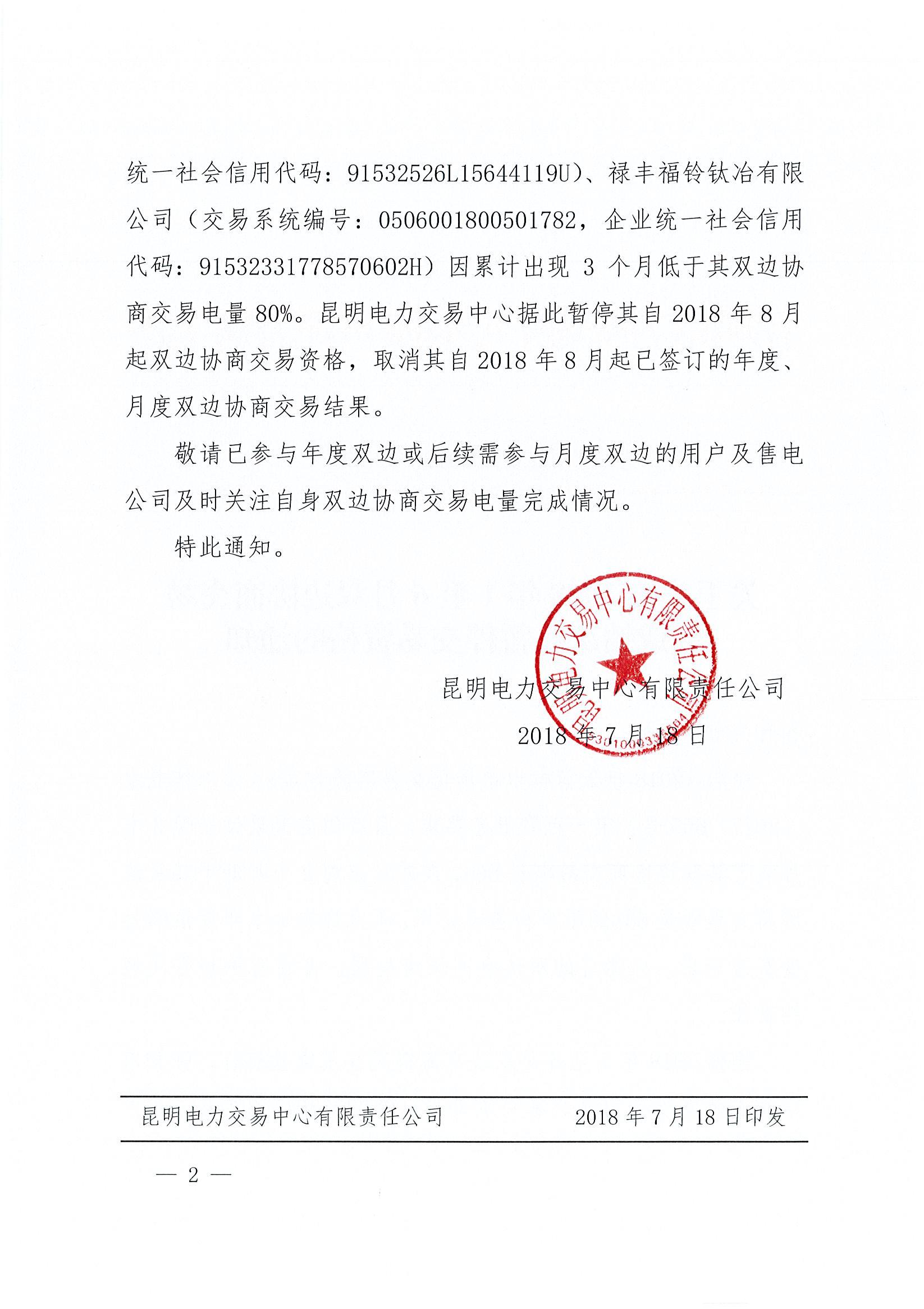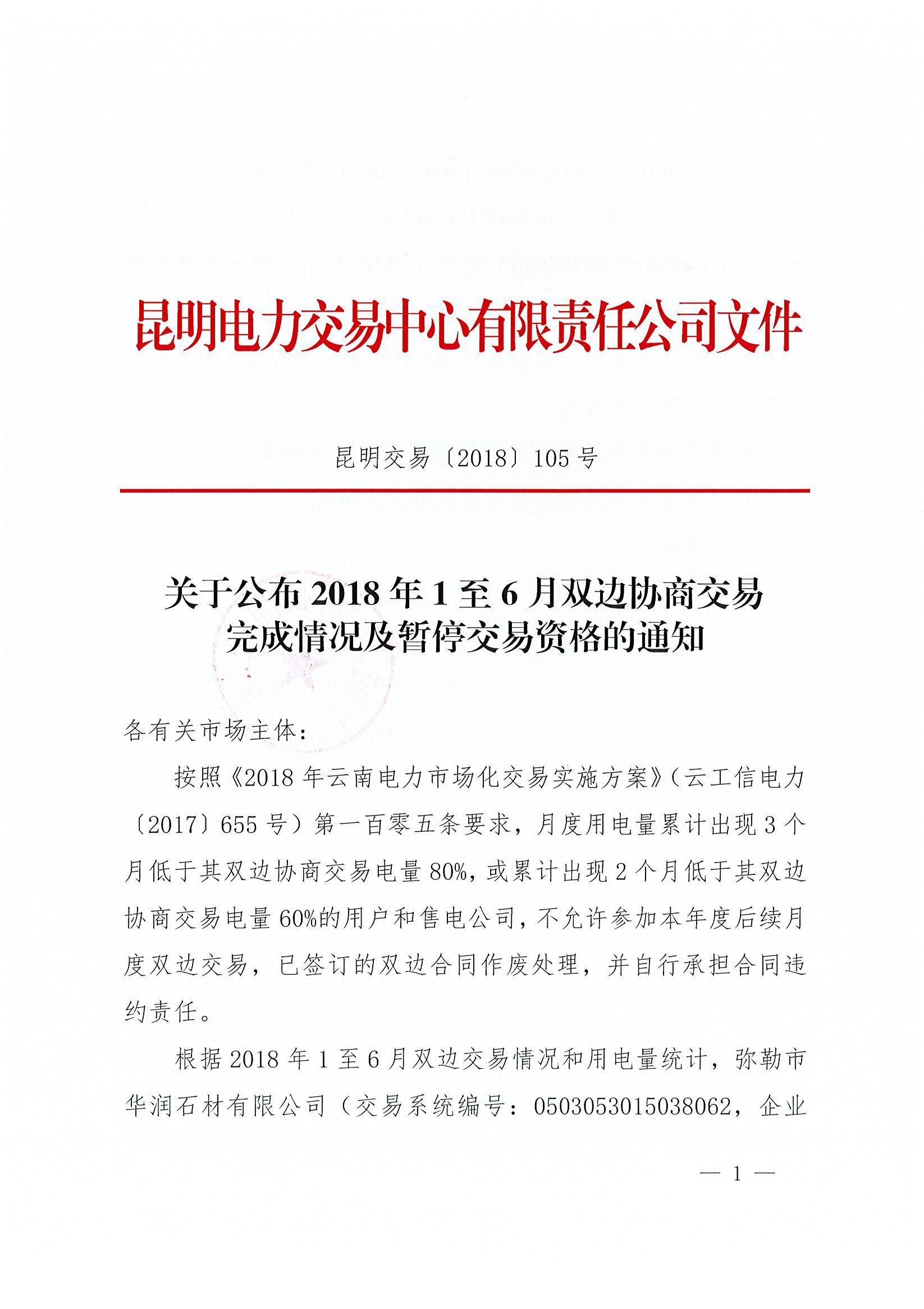 昆明電力交易中心今日發(fā)布了《關(guān)于公布2018年1至6月雙邊協(xié)商交易完成情況及暫停交易資格的通知》,根據(jù)2018年1至6月雙邊交易情況和用電量統(tǒng)計(jì),彌勒市華潤石材有限公司、祿豐福鈴鈦冶有限公司兩家市場主體因累計(jì)出現(xiàn)3個(gè)月低于其雙邊協(xié)商交易電量80%。昆明電力交易中心據(jù)此暫停其自2018年8月起雙邊協(xié)商交易資格,取消共自2018年8月起已黎訂的年度、月度雙邊協(xié)商交易結(jié)果。
