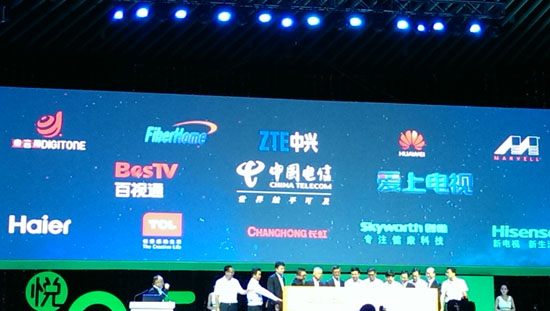 CNII網(wǎng)訊 7月24日,中國(guó)電信集團(tuán)公司在北京召開發(fā)布會(huì),宣布與終端廠家、芯片廠家、電視機(jī)廠家、渠道商和應(yīng)用提供商等共同發(fā)起成立智慧家庭產(chǎn)業(yè)聯(lián)盟。烽火通信憑借在智慧家庭終端領(lǐng)域優(yōu)異的技術(shù)實(shí)力和良好的市場(chǎng)表現(xiàn),以及與中國(guó)電信長(zhǎng)期深入的合作關(guān)系,被推選為聯(lián)盟副理事長(zhǎng)單位。烽火通信副總裁曾軍先生代表公司參加了此次大會(huì),并在儀式上點(diǎn)亮了印有烽火logo的燈箱。