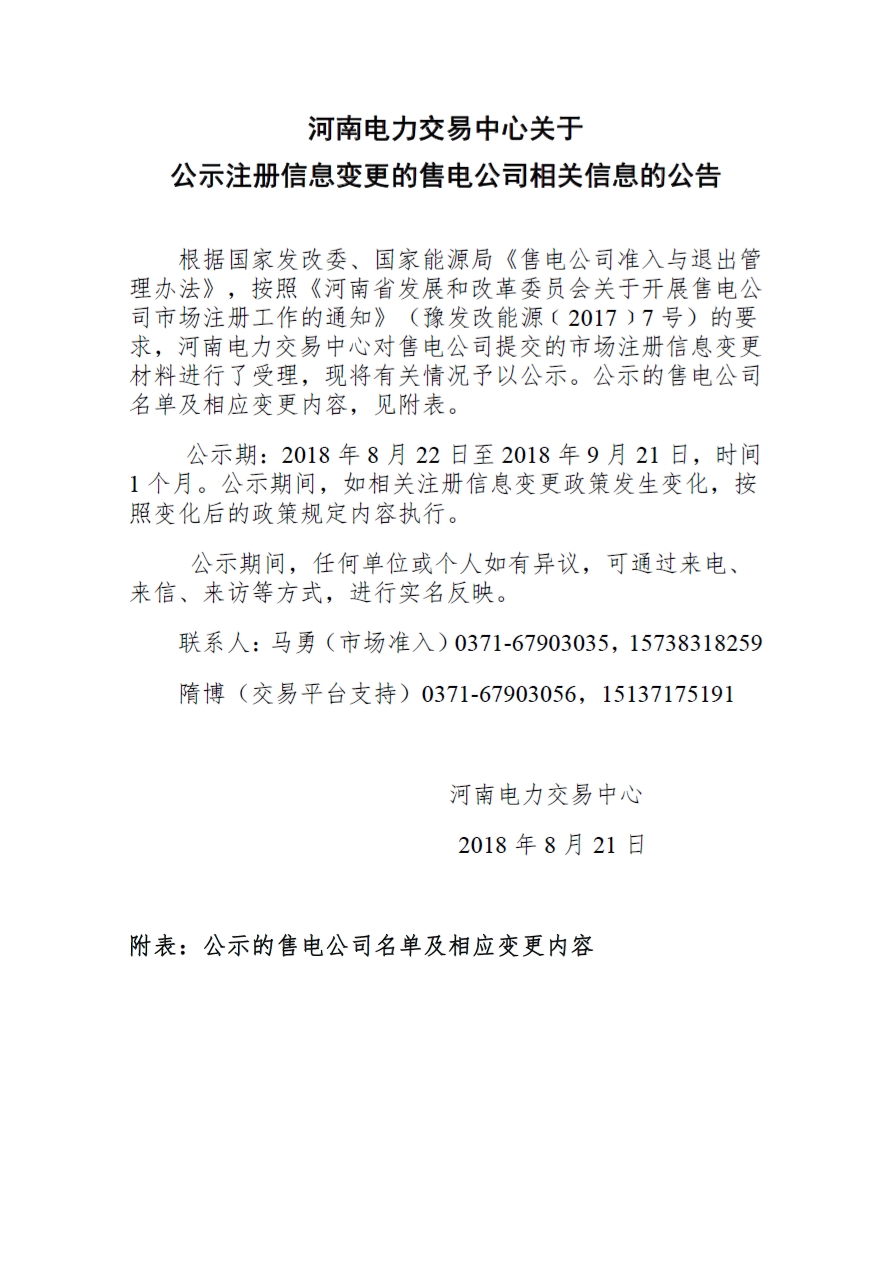 河南電力交易中心日前發(fā)布了《河南電力交易中心關(guān)于公示注冊信息變更的售電公司相關(guān)信息的公告》,根據(jù)國家發(fā)改委、國家能源局《售電公司準(zhǔn)入與退出管理辦法》,按照《河南省發(fā)展和改革委員會關(guān)于開展售電公司市場注冊工作的通知》(豫發(fā)改能源(2017)7號)的要求,河南電力交易中心對鄭州沃特節(jié)能科技股份有限公司提交的市場注冊信息變更材料進(jìn)行了受理,現(xiàn)將有關(guān)情況予以公示。公示期:2018年8月22日至2018年9月21日,時間1個月。詳情如下: