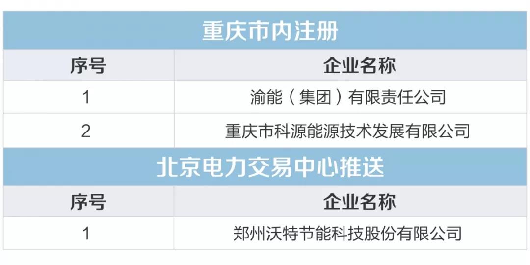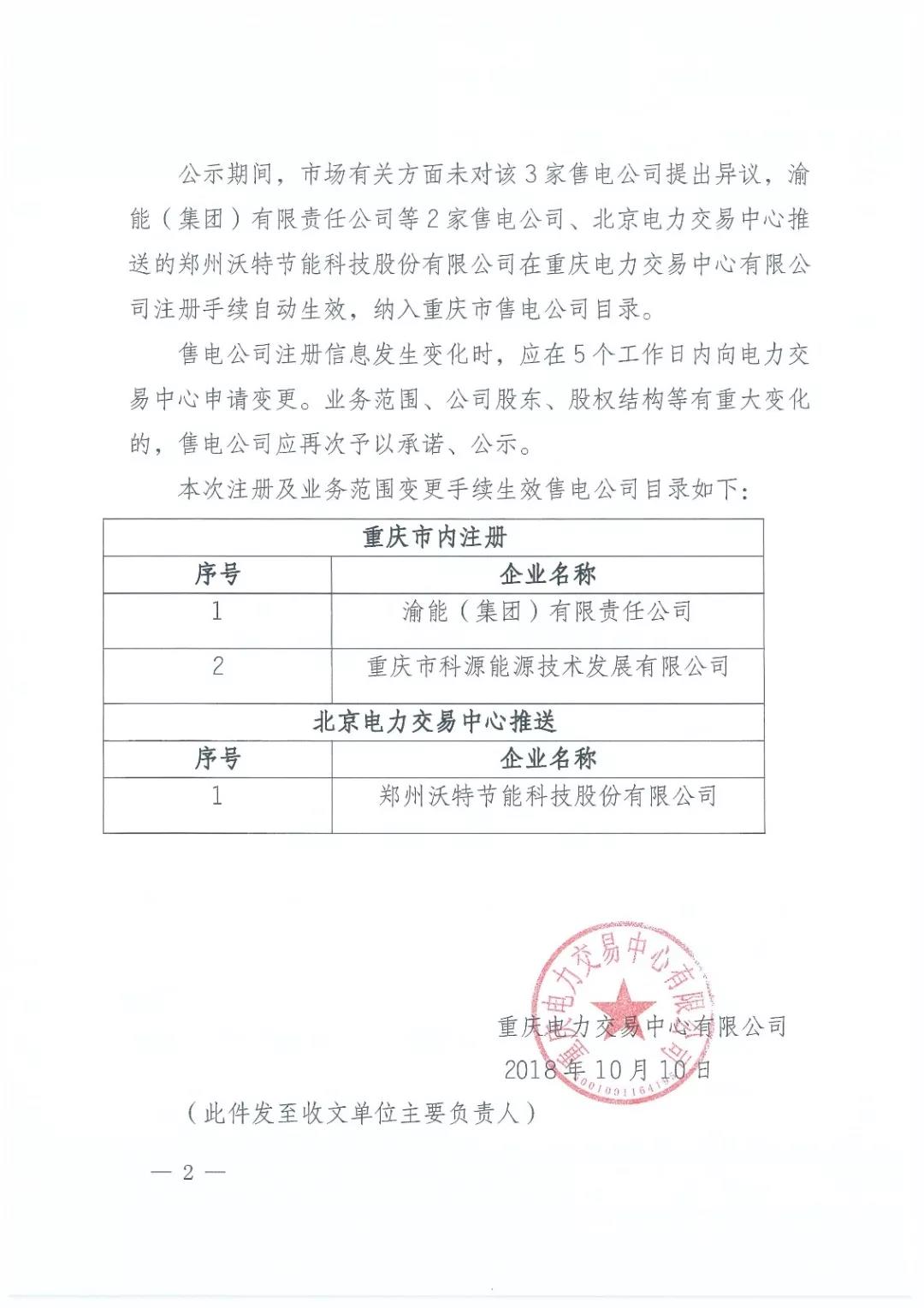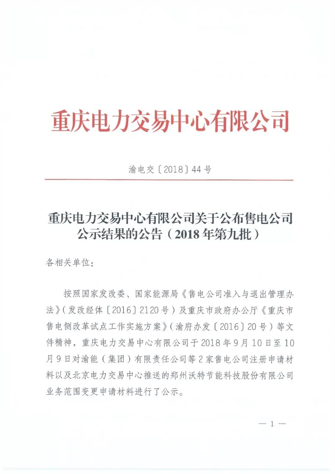 按照國家發(fā)改委、國家能源局《售電公司準(zhǔn)入與退出管理辦法》(發(fā)改經(jīng)體〔2016〕2120號(hào))及重慶市政府辦公廳《重慶市售電側(cè)改革試點(diǎn)工作實(shí)施方案》(渝府辦發(fā)〔2016〕20號(hào))等文件精神,重慶電力交易中心有限公司于2018年9月10日至10月9日對(duì)渝能(集團(tuán))有限責(zé)任公司等2家售電公司注冊(cè)申請(qǐng)材料以及北京電力交易中心推送的鄭州沃特節(jié)能科技股份有限公司業(yè)務(wù)范圍變更申請(qǐng)材料進(jìn)行了公示。