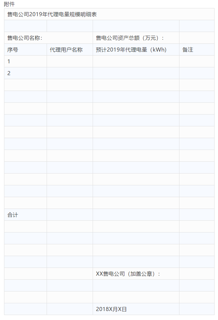 1.提交內(nèi)容:售電公司資產(chǎn)總額、截至2018年10月份已簽訂代理合同的用戶明細、2019年預(yù)計用電量、2019年售電公司代理售電量規(guī)模(表格見附件)。