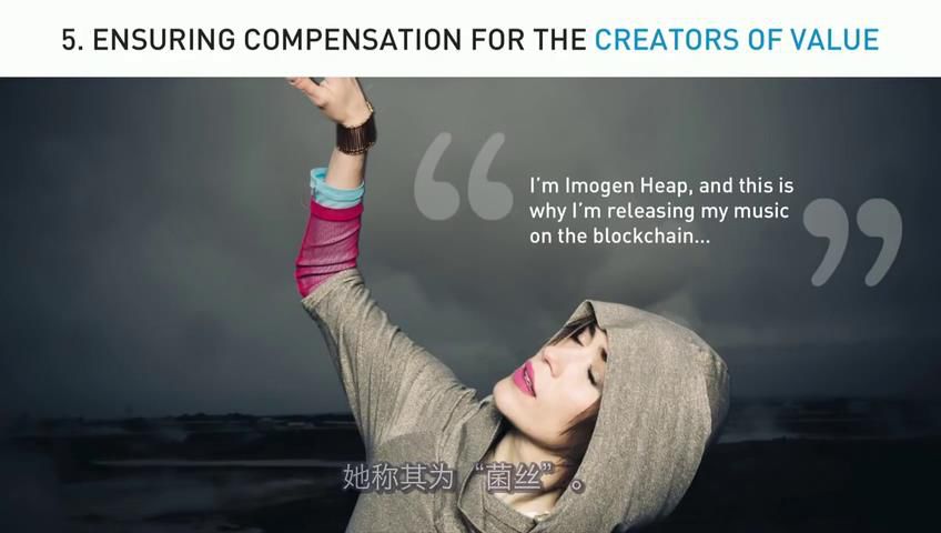 就拿音樂來說,音樂家們只在食物鏈的末端獲得一些殘渣碎屑。在25年前,如果你是一個作曲家,寫出一首流行的歌曲,賣出一百萬首單曲,你可以獲得大約45000美元的報酬。而現(xiàn)在,作曲家的你寫出一首流行的歌曲,被百萬次播放,你并不能得到45000美元,你只能得到36美元,足以買一個不錯的披薩了。所以伊莫金·希普一位榮獲格萊美獎的創(chuàng)作歌手,現(xiàn)在把音樂發(fā)表在一個區(qū)塊鏈的生態(tài)系統(tǒng)上,她稱其為“菌絲”,其中的音樂有著智能協(xié)議,音樂保護著她的知識產(chǎn)權(quán),你想要聽歌嗎?它是免費的,或者會有幾分錢流入數(shù)字賬戶,如果想要在電影中使用這首歌,那就是另外價格,知識產(chǎn)權(quán)都有詳細的說明。你想作為手機鈴聲?那也是另外一個價格。她描述到,歌曲成為了商業(yè),在這個平臺上歌曲實現(xiàn)了商業(yè)化,保護了作者的權(quán)利。并且因為歌曲采用了一種類似于銀行賬戶的支付系統(tǒng),所有的錢都會到藝術家的手中,他們掌控了行業(yè),而不是由那些強大的中間商所控制?,F(xiàn)在,不僅僅是歌曲作家,任何形式的創(chuàng)作活動,比如美術、發(fā)明、科學發(fā)現(xiàn)、新聞記者各行各業(yè)沒有得到公平報酬的人,而有了區(qū)塊鏈,他們將在區(qū)塊鏈上得到巨大收益,那樣可真棒。