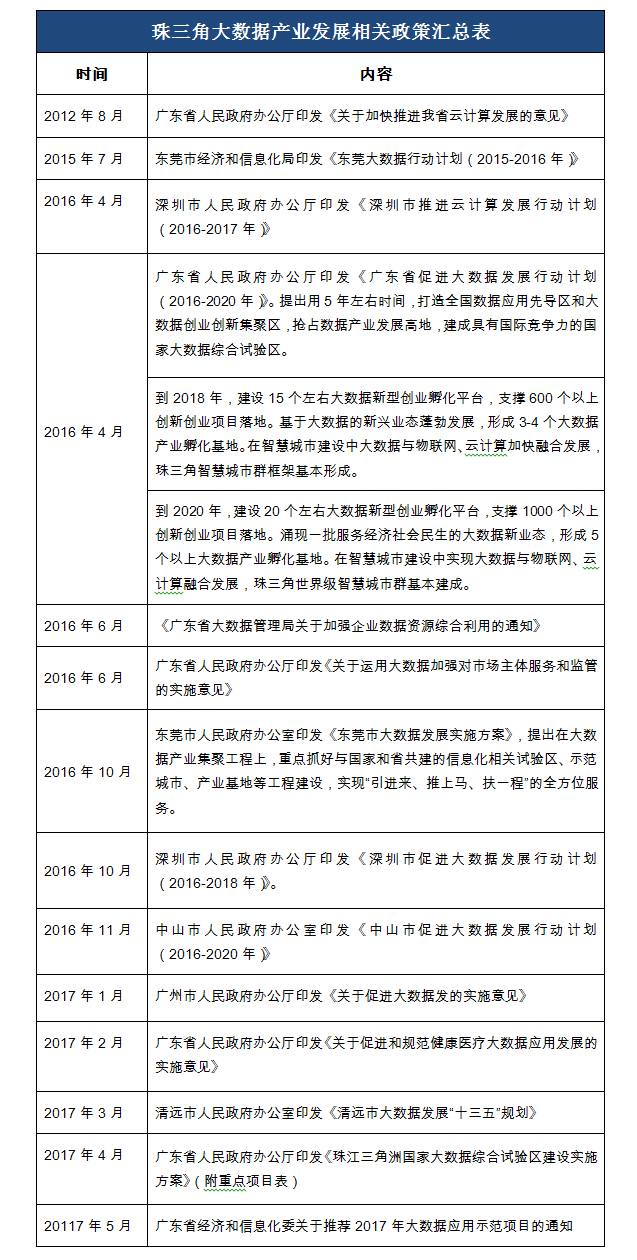 2016年10月8日,國家發(fā)展改革委、工業(yè)和信息化部、中央網(wǎng)信辦聯(lián)合發(fā)文,包括珠江三角洲在內(nèi)的七個區(qū)域正式獲批建設國家大數(shù)據(jù)綜合實驗區(qū)。《珠江三角洲國家大數(shù)據(jù)綜合試驗區(qū)建設實施方案》明確提出:通過3年左右的探索實踐,珠江三角洲國家大數(shù)據(jù)綜合試驗區(qū)開展大數(shù)據(jù)創(chuàng)新試驗取得顯著成效。大數(shù)據(jù)資源方面,匯聚政務、社會、行業(yè)和企業(yè)海量數(shù)據(jù)資源,數(shù)據(jù)基礎設施高度集約,數(shù)據(jù)資源高度共享開放,數(shù)據(jù)資源權益得到有效保障;大數(shù)據(jù)應用方面,在社會治理、公共服務及行業(yè)發(fā)展等領域形成一批大數(shù)據(jù)創(chuàng)新應用示范,推動社會治理精準化、公共服務均等化,帶動傳統(tǒng)行業(yè)商業(yè)模式創(chuàng)新、經(jīng)營管理方式變革,大數(shù)據(jù)綜合應用居全國領先水平;大數(shù)據(jù)產(chǎn)業(yè)方面,涌現(xiàn)一批大數(shù)據(jù)新技術、新產(chǎn)品、新標準,基于大數(shù)據(jù)的創(chuàng)業(yè)創(chuàng)新和新興業(yè)態(tài)蓬勃發(fā)展,大數(shù)據(jù)產(chǎn)業(yè)鏈進一步健全,形成大數(shù)據(jù)產(chǎn)業(yè)集聚發(fā)展態(tài)勢,基本建成輻射帶動效應強、示范引領作用顯著、具備國際競爭力的跨區(qū)域類大數(shù)據(jù)綜合試驗區(qū)。相關配套政策見下表: