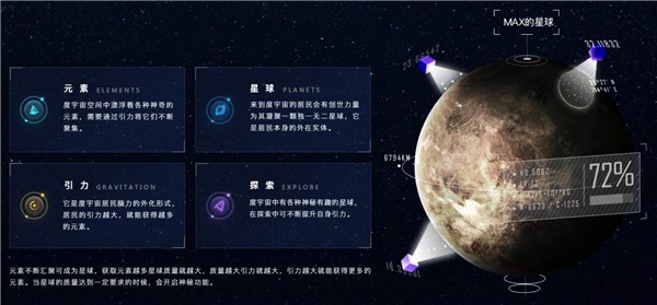 官網(wǎng)文案顯示,度宇宙是由各種稀有元素組成的神奇世界。在這里,你將擁有自己獨(dú)一無二的星球,從自己的星球出發(fā),穿越蟲洞,開始星際旅行;在旅行過程中,你可以任意著陸探索到的星球,在這些星球上有各種有趣的際遇。