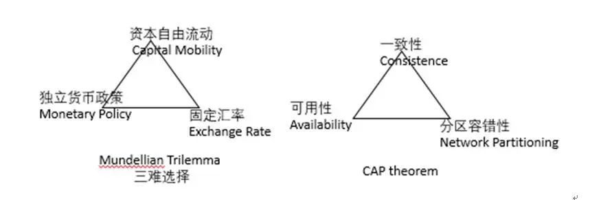 現(xiàn)實(shí)世界不可能是完美的,我們往往在各種三元悖論的權(quán)衡之中尋找平衡點(diǎn)。在經(jīng)濟(jì)學(xué)上有個(gè)“蒙代爾不可能三角”(Mundellian Trilemma),指的是一個(gè)國(guó)家不可能把獨(dú)立貨幣政策(Monetary Policy)、固定匯率(Exchange Rate)和資本自由流動(dòng)(Capital Mobility)三者兼顧到,往往只能三取二舍一。在分布式計(jì)算領(lǐng)域,也有人們認(rèn)可并熟知的CAP理論,即一致性(Consistence)、可用性(Availability)和分區(qū)容錯(cuò)性(Network Partitioning)三者不能得兼,只能三選二,如圖10-1所示。
