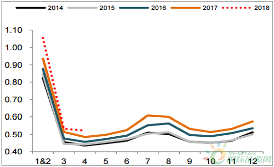 3-5月發(fā)電量煤耗高頻數(shù)據(jù)持續(xù)改善,總量需求無(wú)需過(guò)渡悲觀。從高頻發(fā)電煤耗數(shù)據(jù)來(lái)看,3-4月煤耗數(shù)據(jù)增速處于回升態(tài)勢(shì),其中2018年3、4月六大電廠煤耗為分別為1977.83萬(wàn)噸和2019.33萬(wàn)噸,較2017年同期分別增長(zhǎng)-2.5%和5.5%,這或與本年復(fù)工延后存在一定關(guān)系,另外根據(jù)5月上半月發(fā)電煤耗來(lái)看,1-15日的日均煤耗為67.06萬(wàn)噸,較2017年同期60.82萬(wàn)噸水平增長(zhǎng)10.26%,日耗增速處于持續(xù)回升過(guò)程中。