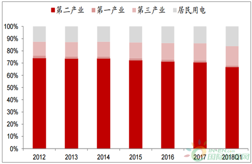 2012-2018Q1國(guó)內(nèi)細(xì)分產(chǎn)業(yè)用電量占比統(tǒng)計(jì)