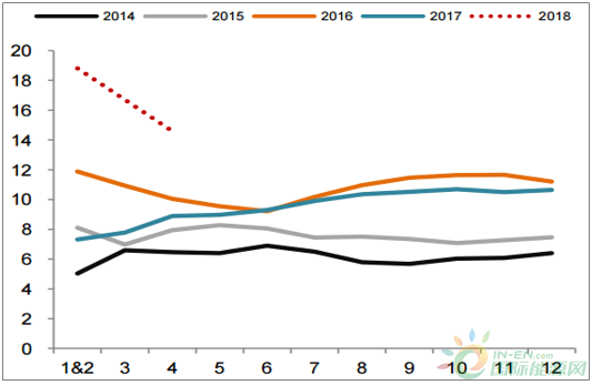 2014-2018國(guó)內(nèi)月度用電量增速統(tǒng)計(jì)(百分比)