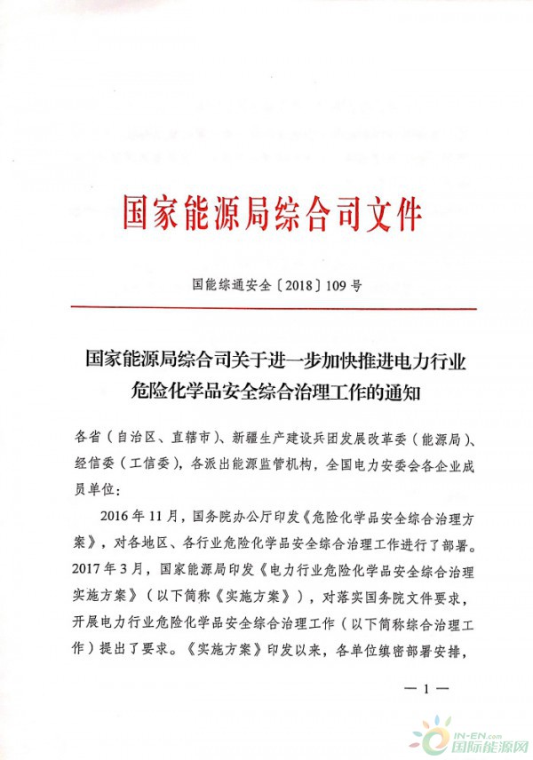 國家能源局:關(guān)于進一步加快推進電力行業(yè)危險化學(xué)品安全綜合治理工作的通知