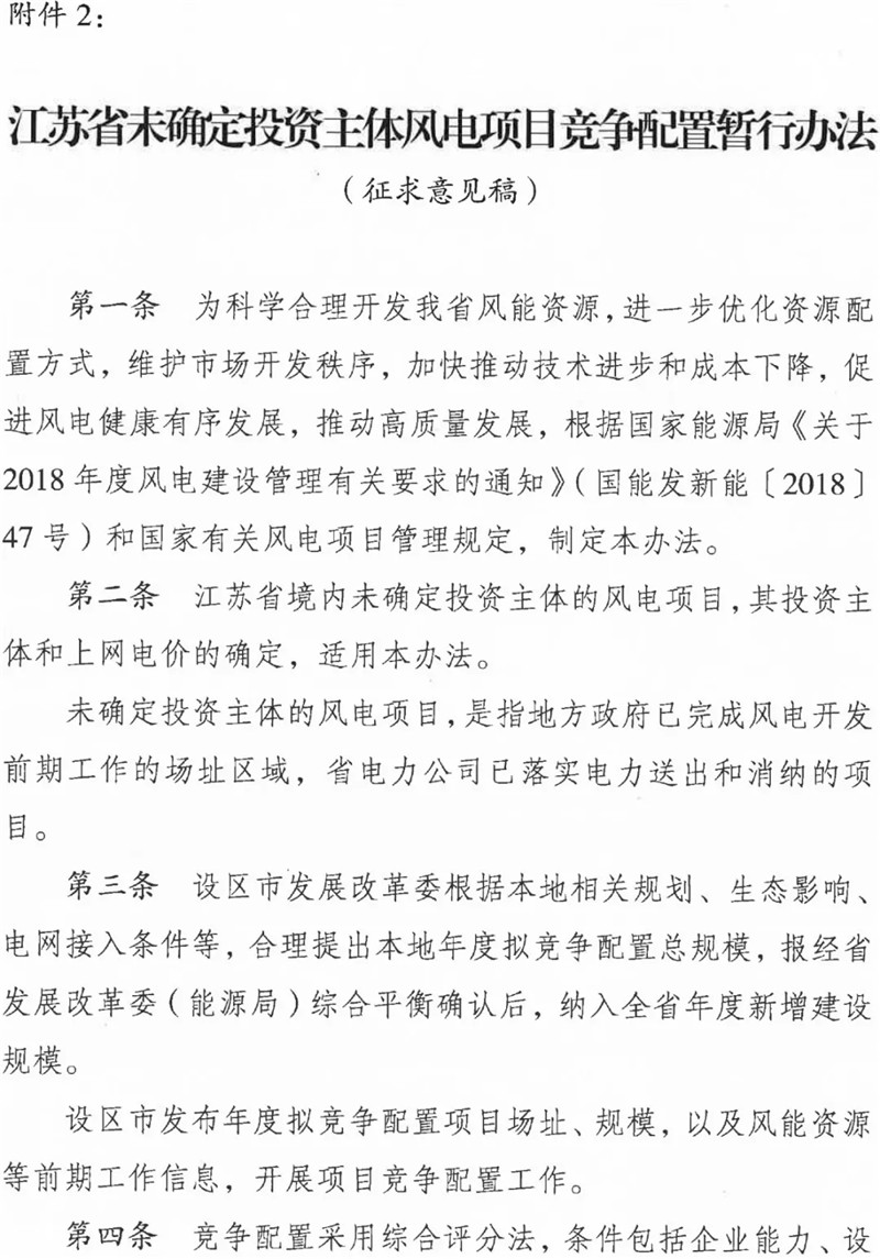 今日,江蘇省發(fā)改委發(fā)布《江蘇省風(fēng)電項(xiàng)目競(jìng)爭(zhēng)配置暫行辦法》、《江蘇省未確定投資主體風(fēng)電項(xiàng)目競(jìng)爭(zhēng)配置暫行辦法》(征求意見(jiàn)稿)。