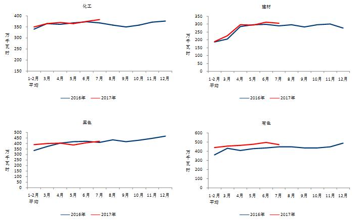1-7月份,化學(xué)原料制品、非金屬礦物制品、黑色金屬冶煉和有色金屬冶煉四大高載能行業(yè)用電量合計10381億千瓦時,同比增長6.0%,增速比上年同期提高8.7個百分點;合計用電量占全社會用電量的比重為29.2%,對全社會用電量增長的貢獻(xiàn)率為25.5%。其中,化工行業(yè)用電量2554億千瓦時,同比增長3.5%,增速比上年同期提高0.1個百分點;建材行業(yè)用電量1807億千瓦時,同比增長4.0%,增速比上年同期提高3.9個百分點;黑色金屬冶煉行業(yè)用電量2774億千瓦時,同比增長2.4%,增速比上年同期提高11.0個百分點;有色金屬冶煉行業(yè)3246億千瓦時,同比增長12.7%,增速比上年同期提高16.1個百分點。