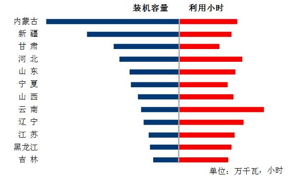 圖6  1-7月份風(fēng)電裝機(jī)較多省份風(fēng)電裝機(jī)容量和設(shè)備利用小時