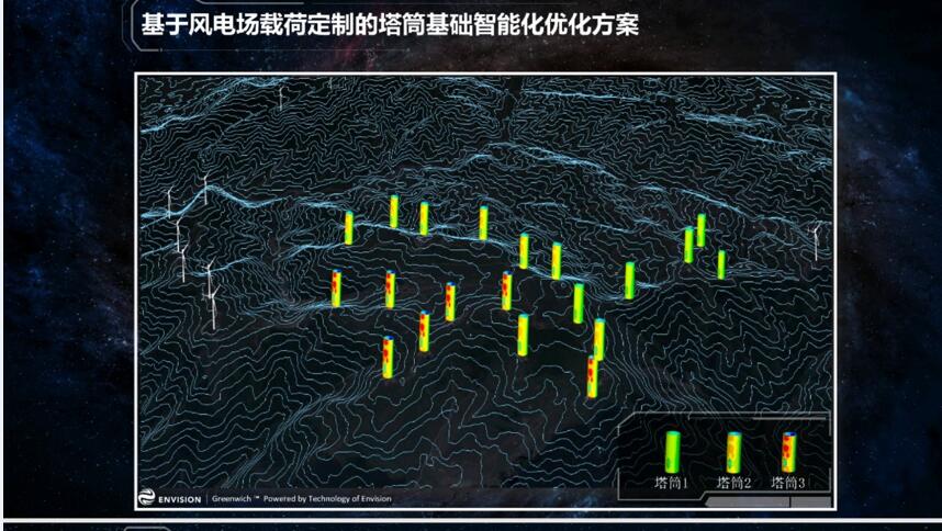 最后還有一部分,塔筒和基礎(chǔ),我們很欣慰的看到這幾年業(yè)界都已經(jīng)認(rèn)識到,哪怕只有一種機(jī)型,也不需要盲目保守的僅提供一種塔筒重量,包括基礎(chǔ)也是一樣的,就拿遠(yuǎn)景EN-121/2.2MW機(jī)型,設(shè)計風(fēng)速6.5米的風(fēng)速,湍流是B,我們有一個風(fēng)場測試下來之后風(fēng)速是5.98米,湍流是C,這是先把風(fēng)速轉(zhuǎn)化為到機(jī)位的基礎(chǔ)載荷,再結(jié)合我們的格林模塊給出最優(yōu)的塔筒和基礎(chǔ)設(shè)計,當(dāng)然我們也會靈活考慮落地性,不會說十多個機(jī)位,就提供十多個塔筒。