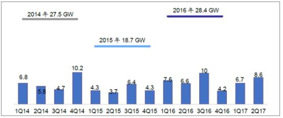 國(guó)內(nèi)的風(fēng)電機(jī)組招標(biāo)量依然保持強(qiáng)勢(shì),預(yù)計(jì)2017年前三季度的招標(biāo)量約21GW,為后續(xù)的裝機(jī)做好了項(xiàng)目?jī)?chǔ)備。2017年1-6月國(guó)內(nèi)公開(kāi)招標(biāo)量15.3GW,同比增長(zhǎng)7.1%,超過(guò)2014年同期(12.6GW)以及2016年同期(14.2GW)。