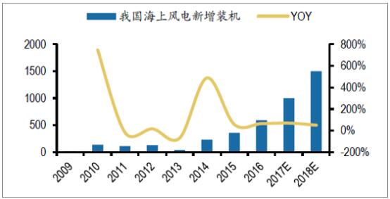 2016年,中國海上風(fēng)電新增裝機(吊裝量)154臺,容量達到59萬千瓦,同比增長64%,累計裝機量達到163萬千瓦。預(yù)計2017年海上風(fēng)電裝機約為100萬千瓦,同比增長超過60%,明年同比增長將超過50%。同時預(yù)計今年海上風(fēng)電項目的招標量有望超過300萬千瓦。
