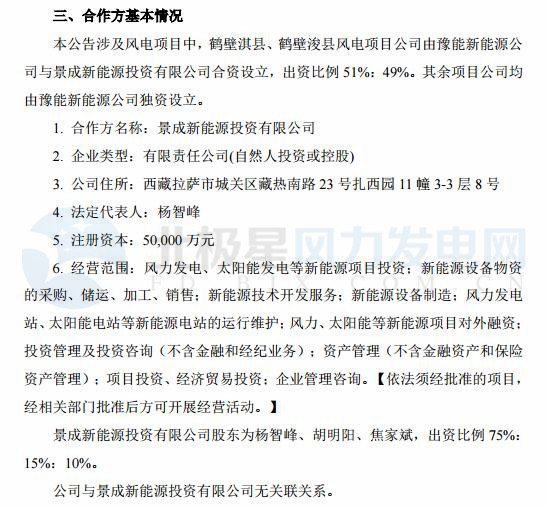 鶴壁淇縣、鶴壁浚縣風電項目公司由豫能新能源公司與景成新能源投資有限公司合資設立,出資比例 51%:49%。待各合資項目取得核準文件后,將根據(jù)投資情況履行上市公司審議披露程序。