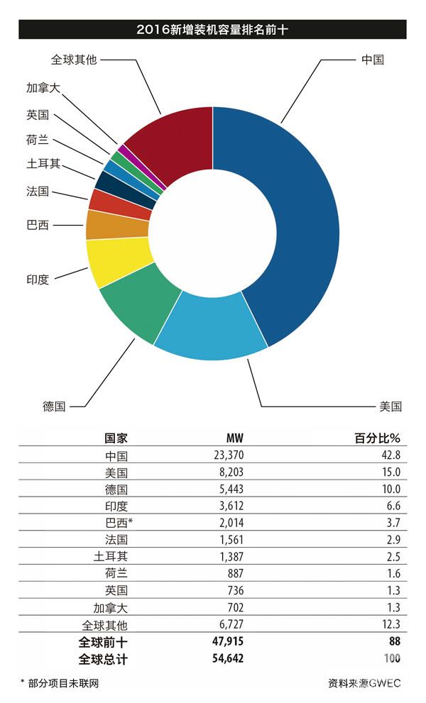 2016年中國(guó)風(fēng)電新增裝機(jī)和累計(jì)裝機(jī)量名列全球第一