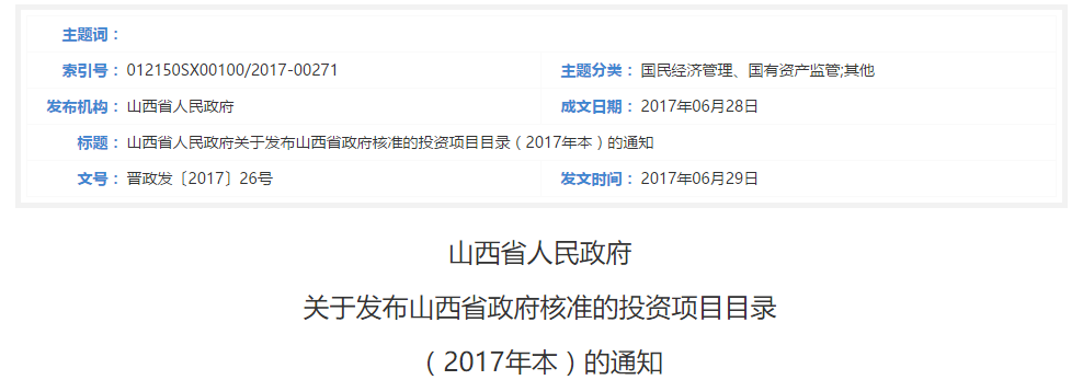 山西省政府核準的投資項目目錄