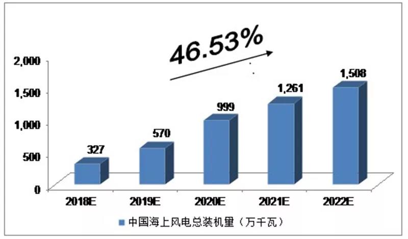 而中國的海上風(fēng)電在近幾年一直保持穩(wěn)定增長,據(jù)相關(guān)機(jī)構(gòu)預(yù)測,我國海上風(fēng)電總裝機(jī)在2018-2022年的年均復(fù)合增長率約為46.53%,即2022年將達(dá)到1508萬千瓦。加之海上風(fēng)電未來的成本下降幅度,對(duì)應(yīng)遠(yuǎn)期海上風(fēng)電市場總空間有望超萬億。