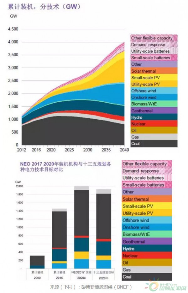 BNEF預(yù)計(jì)“十三五”期間中國未來裝機(jī)結(jié)構(gòu)會(huì)不斷轉(zhuǎn)型,2020年超額完成規(guī)劃的裝機(jī)總量,主要貢獻(xiàn)來自于光伏和風(fēng)電,但是煤電去產(chǎn)能預(yù)計(jì)差強(qiáng)人意。到2040年中國可實(shí)現(xiàn)大部分裝機(jī)都來自清潔能源,清潔能源中大部分裝機(jī)來自陸上風(fēng)電和光伏。