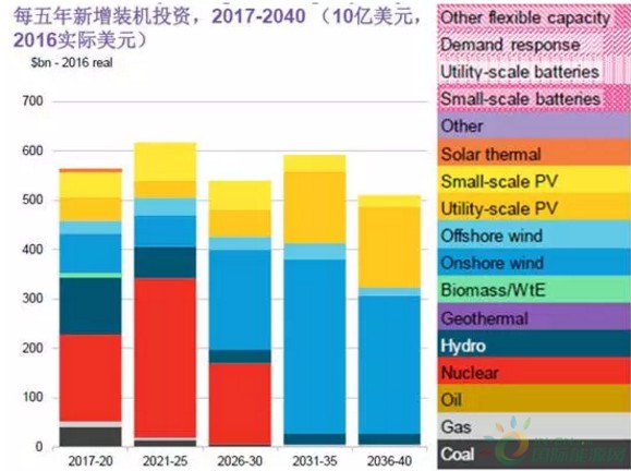 2021-25:陸上風(fēng)電和大型光伏的平均投資額比2017-20年有所降低。原因是BNEF假設(shè)從2020年開始原有的光伏風(fēng)電發(fā)電補(bǔ)貼將不再繼續(xù),伴隨著產(chǎn)能過剩,在光伏和風(fēng)電的成本還沒有低于運(yùn)營中火電成本時(shí),它們將會(huì)“沉淪”一陣子,直到2025年后投資大幅上升。