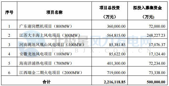 華能國際近日稱擬通過非公開發(fā)行 A 股股票的方式募集資金總額不超過50億元(500,000 萬元),扣除發(fā)行費用后用于投向廣東謝崗燃機項目、江蘇大豐海上風(fēng)電項目、河南澠池鳳凰山風(fēng)電項目、安徽龍池風(fēng)電項目、海南洋浦熱電項目、江西瑞金二期火電項目。