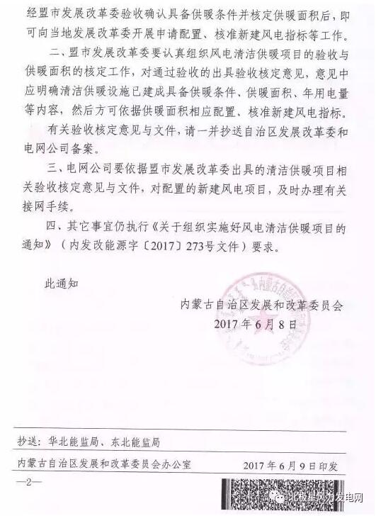 內(nèi)蒙古發(fā)改委近日發(fā)布了《關(guān)于風(fēng)電清潔供暖相關(guān)事宜的通知》。通知指出參與風(fēng)電清潔供暖的有關(guān)企業(yè)待供暖設(shè)施建成后,經(jīng)盟市發(fā)展改革委驗收確認(rèn)具備供暖條件并核定供熱面積后,即可向當(dāng)?shù)匕l(fā)展改革委開展申請配置、核準(zhǔn)新建風(fēng)電項目指標(biāo)等工作。這一政策調(diào)整,就意味著目前建成及在建的風(fēng)電項目在供暖設(shè)施建成通過驗收后,即可申請配置風(fēng)電指標(biāo),有望按照0.47元/千瓦時的上網(wǎng)電價執(zhí)行。以下為通知原文: