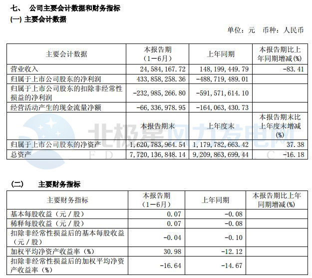 1、 公司實(shí)現(xiàn)扭虧為盈報(bào)告期內(nèi),公司實(shí)現(xiàn)營(yíng)業(yè)收入 24,584,167.72 元,實(shí)現(xiàn)歸屬于上市公司股東的凈利潤(rùn)為 433,858,258.36 元,公司實(shí)現(xiàn)扭虧為盈,主要原因是本期有效控制費(fèi)用開(kāi)支、獲得供應(yīng)商賠償收益、轉(zhuǎn)讓子公司等事項(xiàng)綜合影響;公司總資產(chǎn)為 7,720,136,848,14 元,歸屬于上市公司股東的凈資產(chǎn)為 1,620,783,964.54 元 。