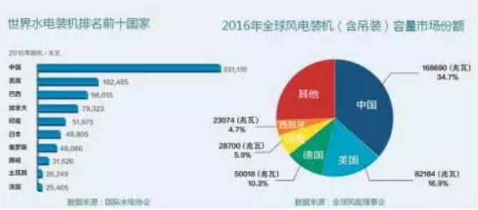 圖1  世界水電裝機排名前十國家  2016年全球風(fēng)電裝機(含吊裝)容量市場份額